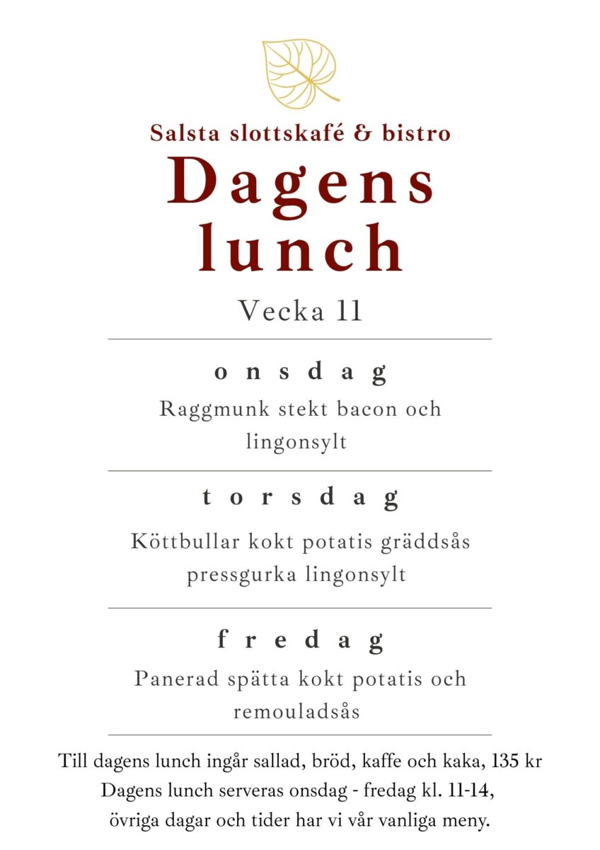 Onsdag till fredag kl. 11–14 serverar vi dagens lunch på Salsta slott. Lunchen inkluderar salladsbord, kaffe och kaka – allt för 135 kr.