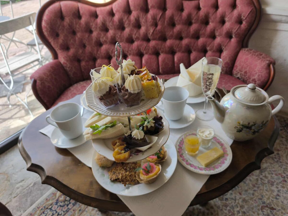 Slottsbakade scones med olika tillbehör, cider, snittar och läckra bakverk som serveras med utvalda teer i slottsmiljö